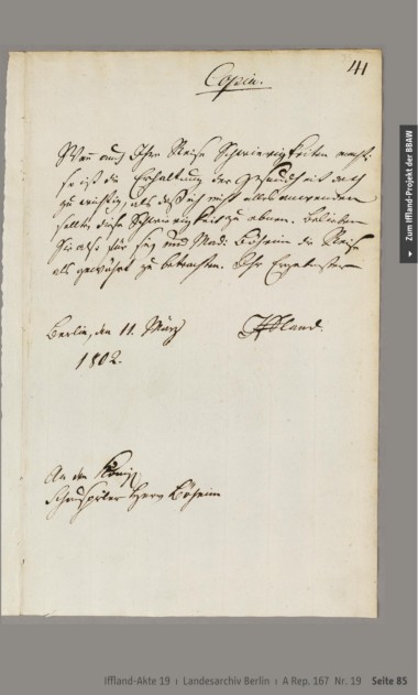 Zum Iffland-Projekt der BBAW Iffland-Akte 19 ı Landesarchiv Berlin ı A Rep. 167 Nr. 19 Seite 85